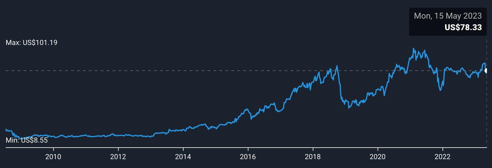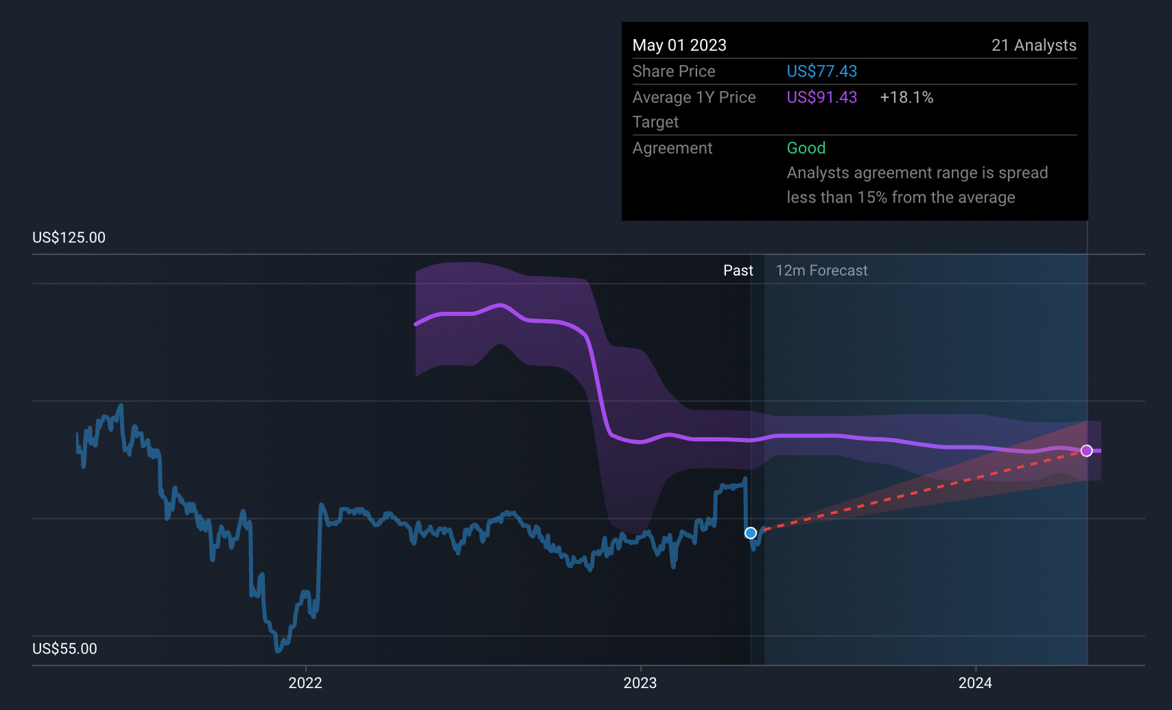 The stock is currently trading at $77 per share, while the average target price for the next 12 months comes to about $91.