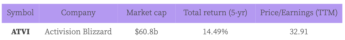Headquartered in California, Activision Blizzard develops gaming content for video consoles, PCs and mobile devices. It generates income through full-game and in-game sales, subscription services as well as licensing to third-party distributors. Its flagship products are franchises like Call of Duty, World of Warcraft, Diablo, Hearthstone, Overwatch, Overwatch League, and Candy Crush.