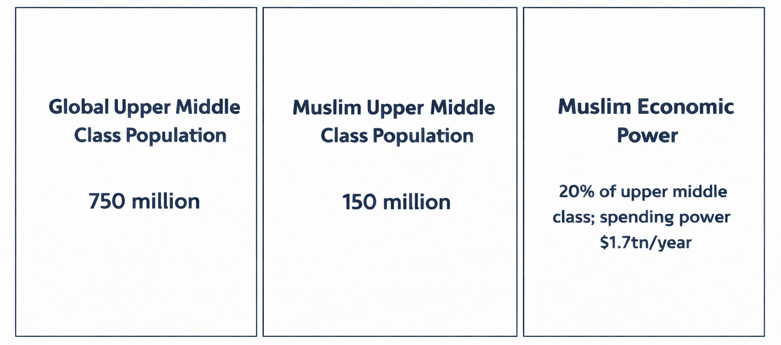 Economic power, once concentrated in the hands of a few Western nations, is undergoing a profound shift. The global Muslim population has grown to approximately 2 billion people, representing nearly a quarter of humanity, with consumer spending across halal sectors reaching $2.43 trillion in 2023 and projected to rise to $3.36 trillion by 2028. Within this vast community lies an emerging upper middle class — estimated at 150 million strong — wielding collective spending power of $1.7 trillion annually.